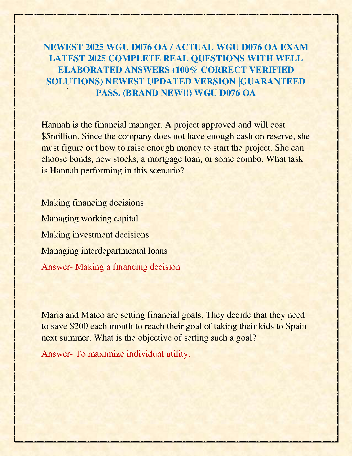 Ace your WGU D076 Objective Assessment with our brand-new 2025/2026 Test Bank for Finance Skills for Managers. This comprehensive resource is packed with the latest, actual exam questions and features detailed, 100% correct and verified answers. Designed specifically to help you master key financial concepts, this study guide ensures you're fully prepared to pass on your first attempt. Stop worrying about resits and secure your success in WGU D076 today with this guaranteed pass solution!