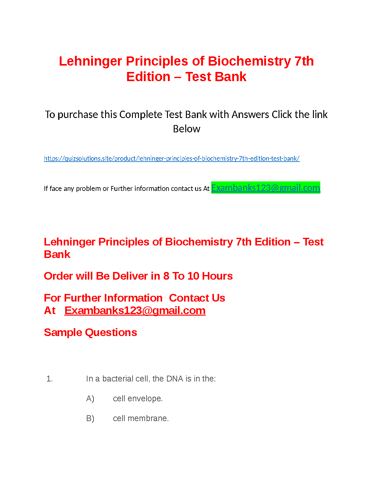 Test Bank For Lehninger Principles of Biochemistry 7th Edition