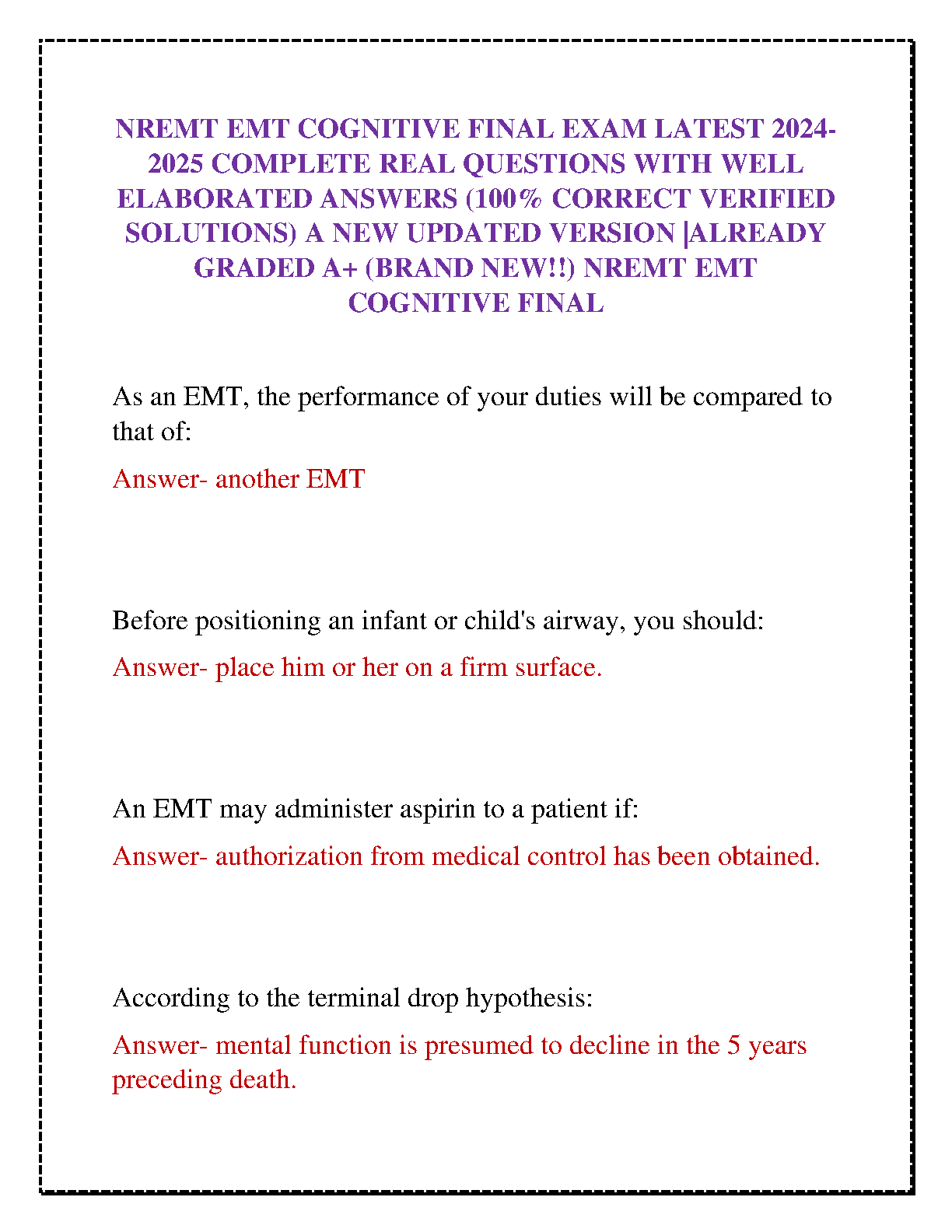 Ace your NREMT EMT Cognitive Final Exam on the very first try with our premier test bank for the 2025-2026 academic year. This comprehensive resource is packed with the latest, real exam questions and features well-elaborated, 100% correct verified answers. Each solution is meticulously crafted to ensure you not only memorize the answers but also understand the core concepts. Already proven to achieve A+ grades, this study guide is your ultimate tool to build confidence, master the material, and pass with flying colors, avoiding costly and time-consuming resits. Secure your EMT certification efficiently with this essential study aid.