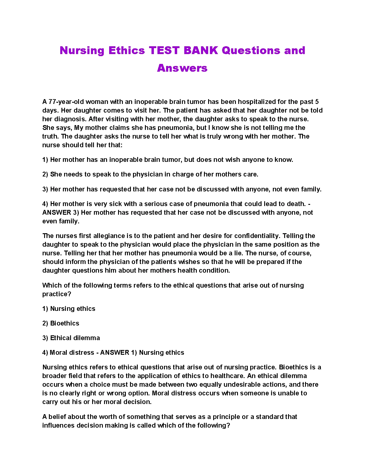 Test Bank For Nursing Ethics Questions and Answers 2023/2024