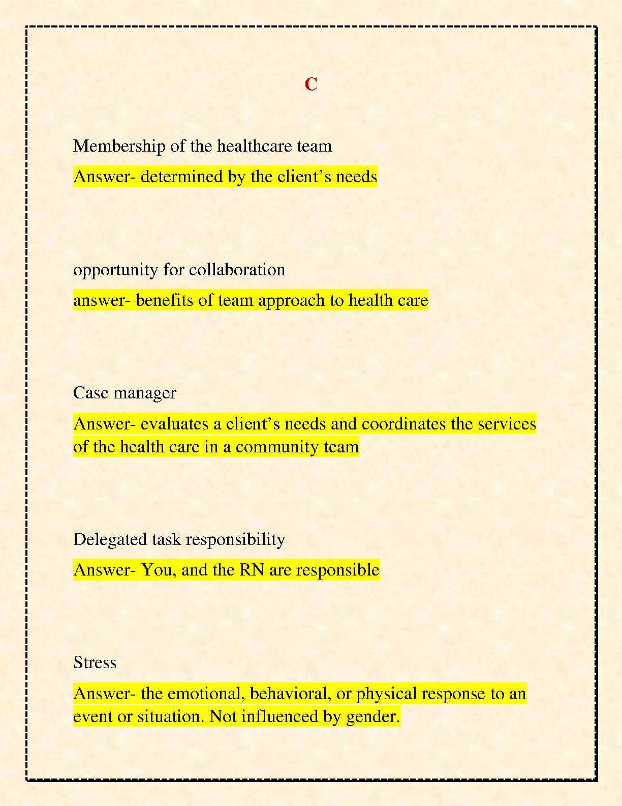 Ace your nursing exams with our latest 2025/2026 Nursing Fundamentals & Management Test Bank. This comprehensive resource provides a complete set of questions and verified answers, covering essential topics such as the roles and membership of the healthcare team, the benefits of collaboration, case manager responsibilities, proper task delegation, and stress management principles. Designed to help you master key concepts and prepare effectively, this study guide is your ultimate tool for passing your exams on the first attempt and building a strong foundation for your nursing career. Avoid resits and study smarter with our targeted Q&A format.