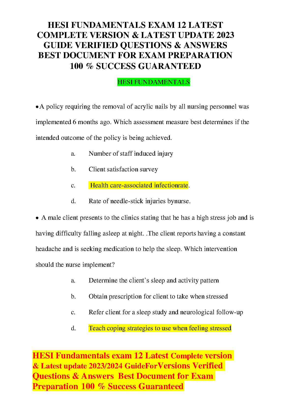 HESI Fundamentals Exam Test Bank 2024: 12 Latest Versions with Verified Questions and Answers for Guaranteed Success