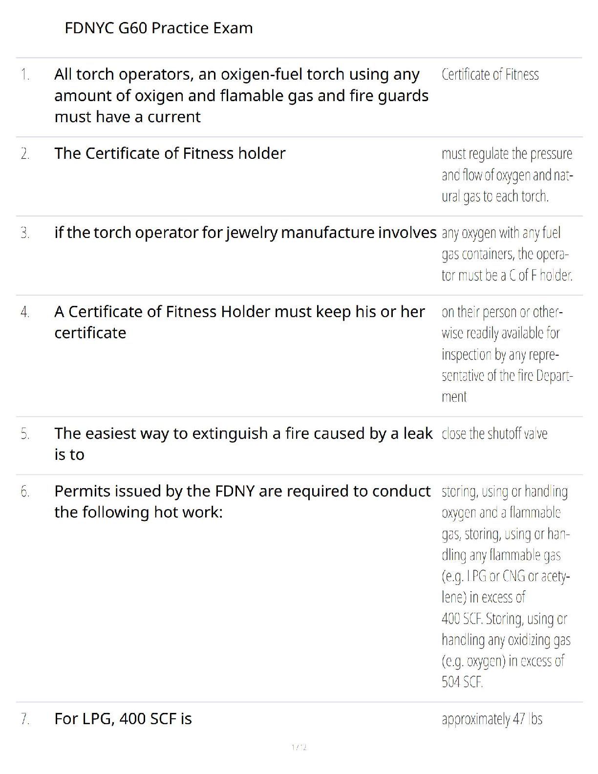 Ace your FDNY G60 Certificate of Fitness for Torch Use of Flammable Gases exam on your first attempt! This comprehensive test bank provides a complete set of practice questions and verified answers, mirroring the actual exam format. Updated for the 2025/2026 testing cycle, this study guide covers all essential topics, from torch operator responsibilities and safety protocols to permit requirements and emergency procedures. Prepare with confidence, master the material, and earn your G60 certification without the stress of retakes.