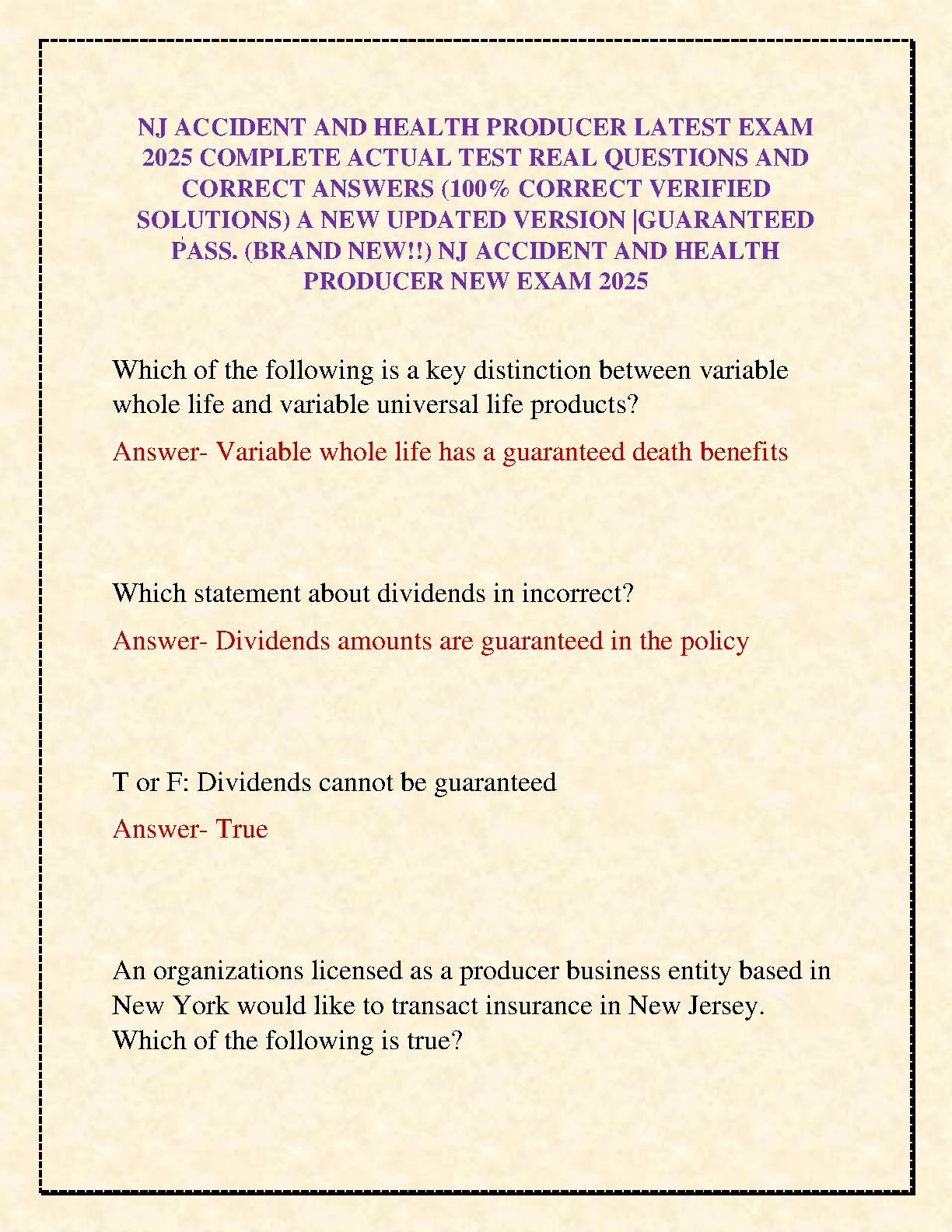 Ace your NJ Accident and Health Producer Exam on the first try with our latest 2025 test bank. This comprehensive resource is packed with real exam questions and 100% correct, verified answers and solutions. Meticulously updated for the current exam version, this guide is your key to mastering the material, understanding complex topics, and walking into the test with confidence. Avoid the stress of resits and secure your license efficiently with this brand-new study material.
