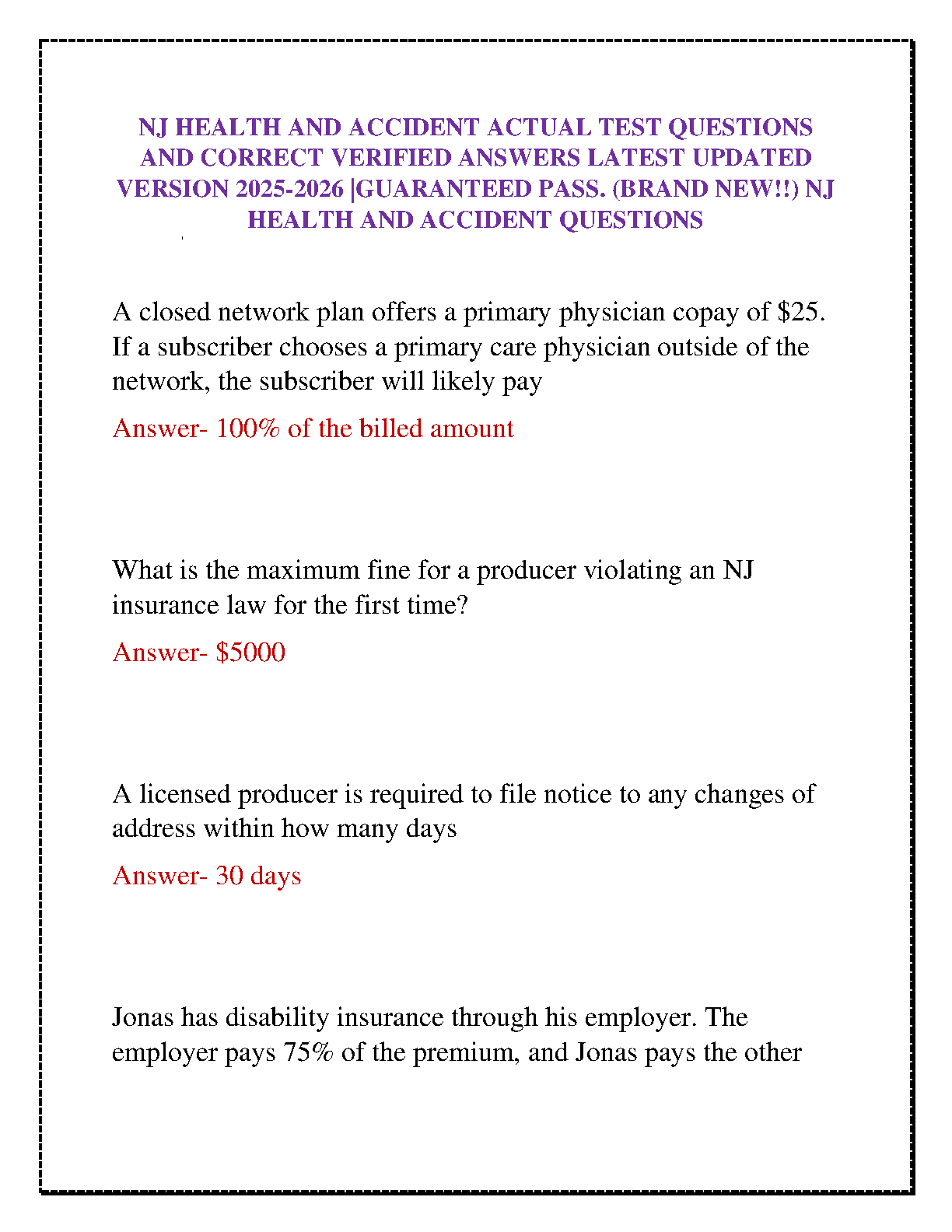 Ace Your NJ Health & Accident Insurance Exam 2025-2026: A Complete Test Bank with Verified Questions and Answers for First-Try Success