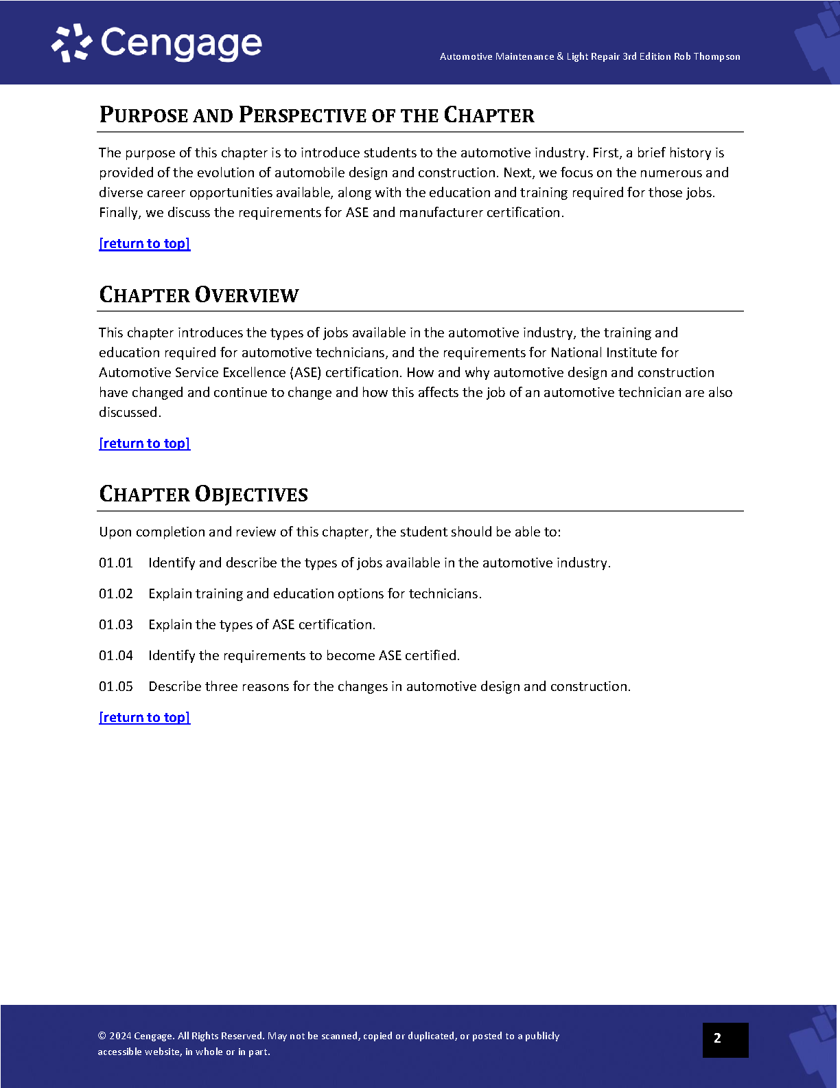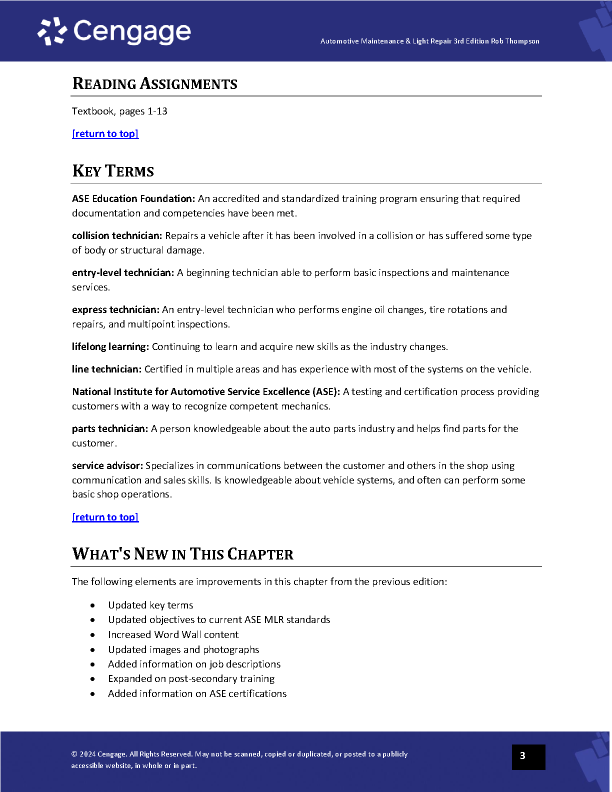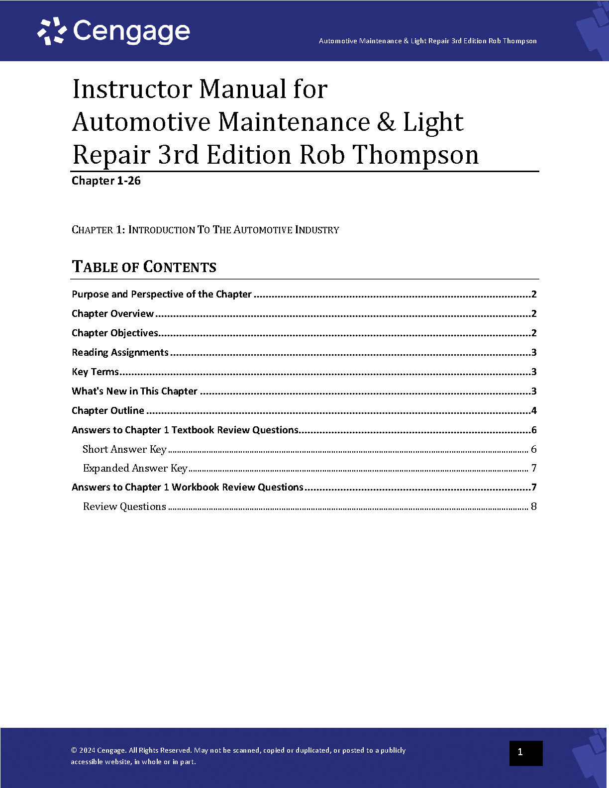 Unlock your full potential and excel in your automotive course with the official Test Bank and Instructor Manual for 'Automotive Maintenance and Light Repair,' 3rd Edition by Rob Thompson. This indispensable resource provides complete, verified answers to all textbook and workbook review questions, offering clear, step-by-step solutions. It is designed to help students thoroughly prepare for exams, understand complex concepts, and master the material effectively. Get the edge you need to pass your exams confidently and build a strong foundation in automotive technology.