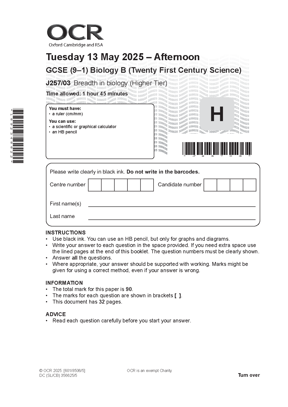 2025 OCR GCSE Biology B Twenty First Century Science Paper 3 (J257/03: Breadth in Biology (Higher Tier))